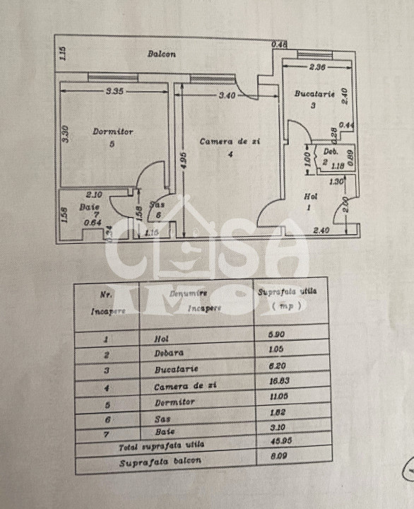 Apartamentul nu are imbunatatiri, beneficiaza doar de anvelopare termica si balconul inchis in termopan. Locuinta dispune de o suprafata utila de 45,95 mp, o suprafata a balconului de 8,09 mp, rezultand astfel o suprafata utila totala de 54.04 mp. Zona este centrala, oferind acces facil din orice zona a orasului. Vederea este pe Vest, pe spatele blocului, oferind momente de liniste in orice moment al zilei. Blocul este inconjurat de copaci, ceea ce reprezinta o oaza de racoare la intrarea in scara.