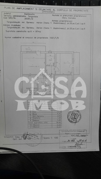 Compania imobiliara CASA IMOB, va propune spre achizitie un apartament spatios format din 3 camere si dependinte, situat la etajul 1 al unui imobil cu 4 nivele din cartierul Micro 3 din Municipiul Targoviste. Apartamentul este confort 1, decomandat, are suprafata utila de 78.82 mp la care se adauga suprafata celor 2 balcoane de 5.59 mp, respectiv 5.24 mp, rezultand astfel o suprafata utila totala de 89.65 mp. Ca si mici imbunatatiri, apartamentul beneficiaza de geamuri din termopan pe structura PVC la toate ferestrele, centrala termica proprie, gresie pe toata suprafata imobilului, iar dormitorul matrimonial este mobilat modern. Ambele balcoane sunt inchise in cornier.