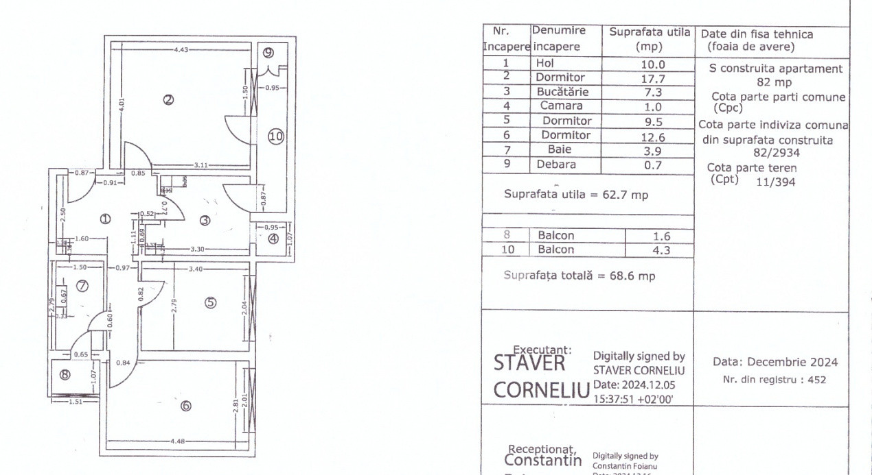 Apartamemntul are suprafata utila de 63 mp, la care i se adauga suprafata balcoanelor de 6 mp, rezultand un total de 69 mp, suprafata construita este de 82 mp, beneficiază de centrală termică în condensație, pe gaz, ARISTON (vechime 2 ani) + calorifere, geamuri din termopan pe structură PVC la cele 2 dormitoare și ușă metalică la intrarea în apartament.