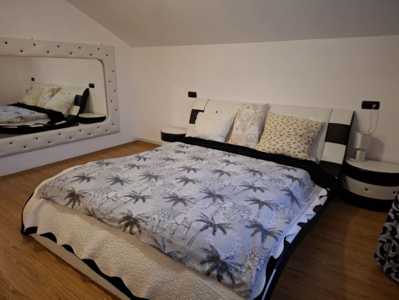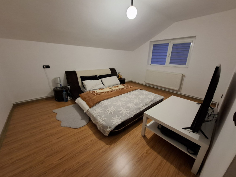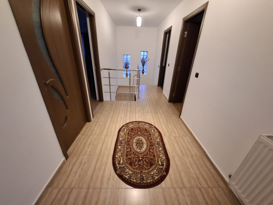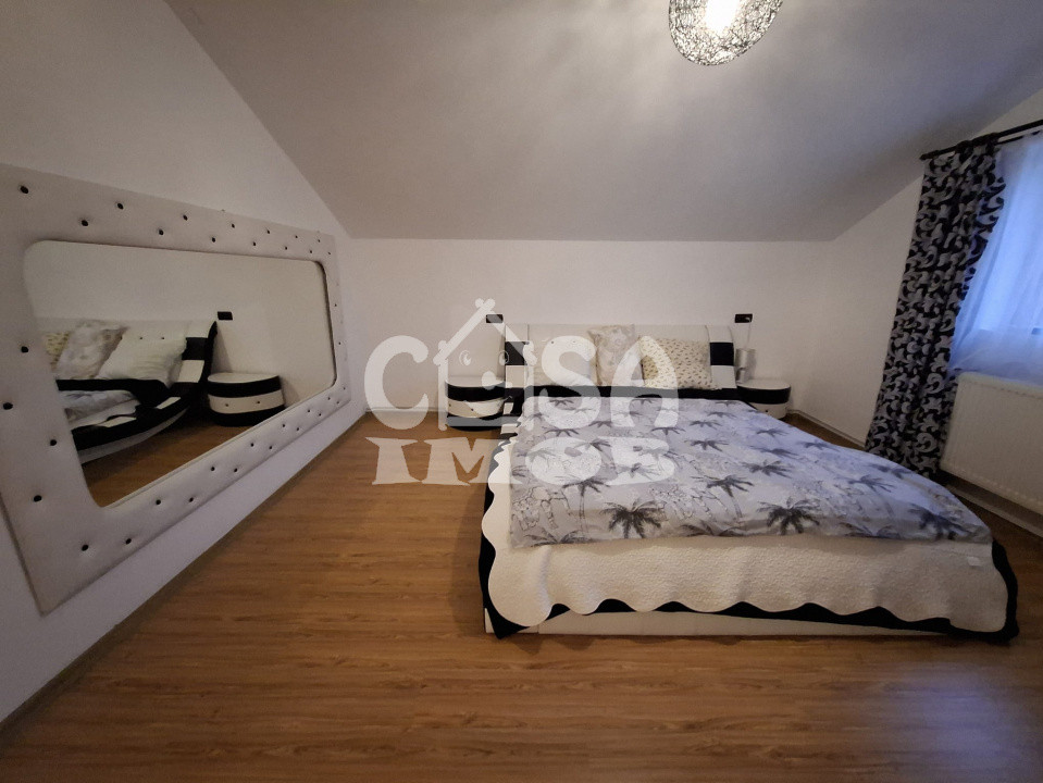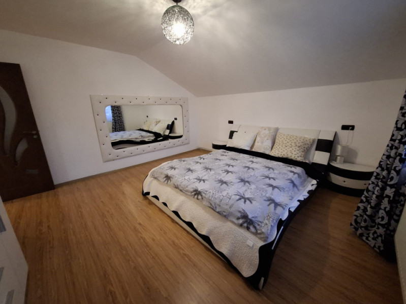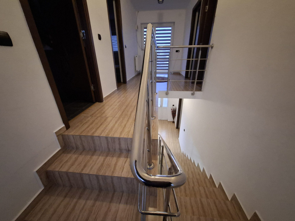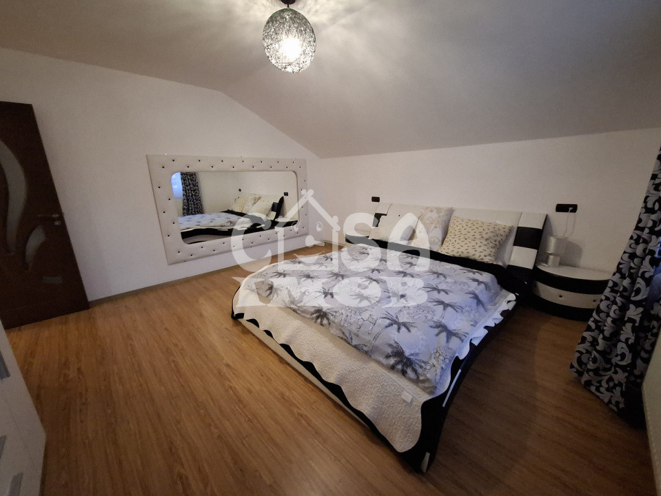 Locuința oferă o suprafață utilă totală de 142 mp, distribuită eficient pe două niveluri. Parterul este dedicat zonei de zi, cu un living primitor, o bucătărie complet utilată și o baie modernă. Mansarda este compartimentată inteligent, cu trei dormitoare luminoase și o baie, oferind intimitate și spațiu pentru întreaga familie.